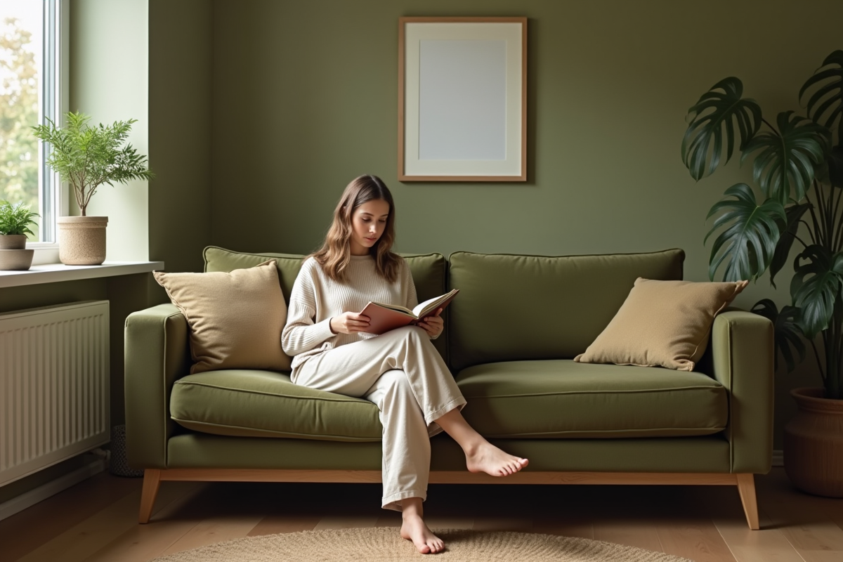 Le salon, quant à lui, accueille volontiers la peinture vert olive sur un ou plusieurs murs. Cette couleur valorise les œuvres d’art, s’accorde aux nuances naturelles : lin, sable, tabac. Imaginez un canapé ficelle, des coussins en velours olive, une table basse en travertin : l’ensemble respire la sophistication sans rien d’ostentatoire. Les tons olive se marient aussi aux bois clairs et aux touches de noir mat pour un effet graphique maîtrisé.